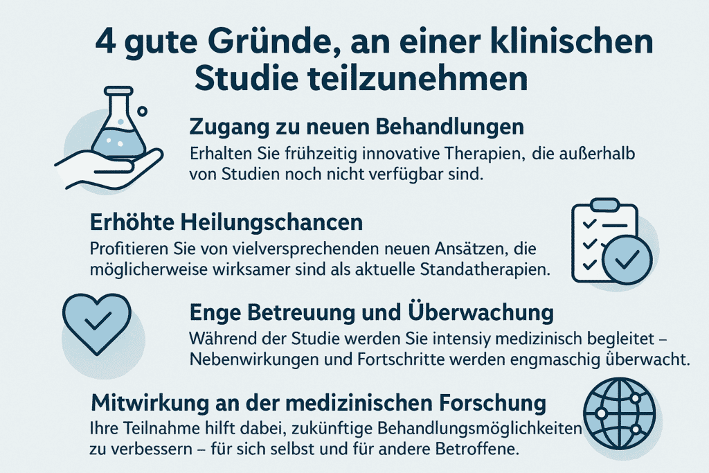 Die Teilnahme an klinischen Studien kann bei Krebs besonders wichtig sein. Das liegt daran, dass Krebserkrankungen sehr komplex und individuell unterschiedlich sind. Gerade bei fortgeschrittenen oder seltenen Krebsarten gibt es manchmal keine Standardtherapien mehr, und Studien können dann neue Möglichkeiten bieten. Viele Fortschritte in der Krebsmedizin – wie zielgerichtete Therapien oder Immuntherapien – wären ohne klinische Studien heute nicht möglich.