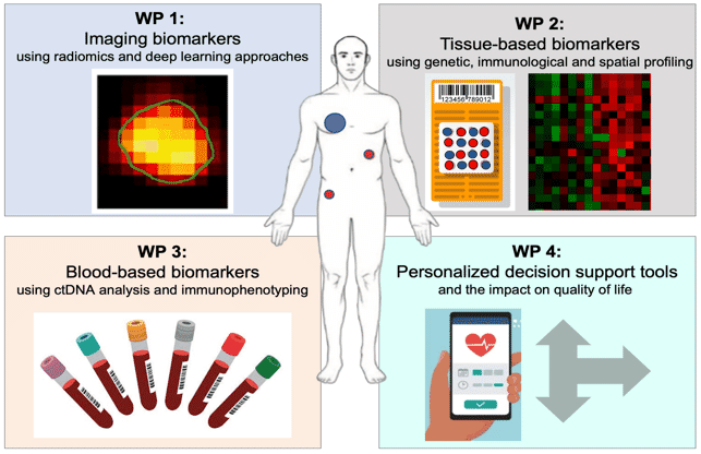 Aim 1 will use computational methods for quantitative analysis of longitudinal radiological images to describe the disease burden and its temporal dynamic more precisely. Aim 2 will perform compari-sons of matched pair tumor specimens of the resected primary tumor and metastases using targeted sequencing, as well as immunological and digital spatial profiling to investigate intra-patient cancer heterogeneity as novel prognostic and predictive marker. Aim 3 will use liquid biopsies before and after definitive local therapy to quantitatively assess response not only radiologically but on a molecu-lar level within the systemic compartment. Lastly, aim 4 will develop and evaluate patient decision support systems to complement the currently limited evidence about the optimal patient-specific systemic treatment strategy.